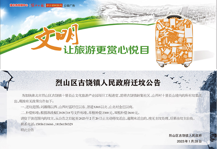 為加快淮北市烈山區(qū)古饒鎮(zhèn)十里長山文化旅游產(chǎn)業(yè)項目工程進度,需將古饒鎮(zhèn)趙集社區(qū)、山西村十里長山境內(nèi)的所有墳?zāi)惯w出,現(xiàn)按有關(guān)政策公告如下: