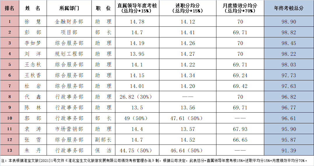 注:本表根據(jù)淮寶文旅[2021]1號(hào)文件《淮北寶生文化旅游發(fā)展有限公司績(jī)效考核管理辦法》制,根據(jù)公司決定,此表總分=直屬領(lǐng)導(dǎo)年度考核15%+述職平均分15%+月度績(jī)效平均分70%。